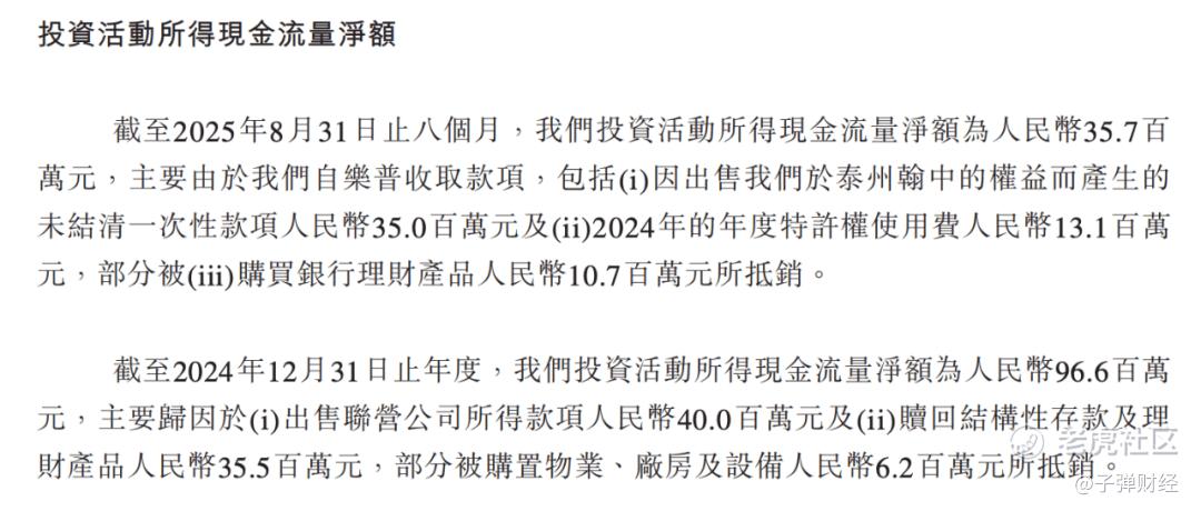 招股书显示,2022年至2024年,公司收到的特许权使用费分别为约70万元、440万元及1310万元。由于该部分收入与公司目前主业无关,因此计入了投资活动所得现金流。