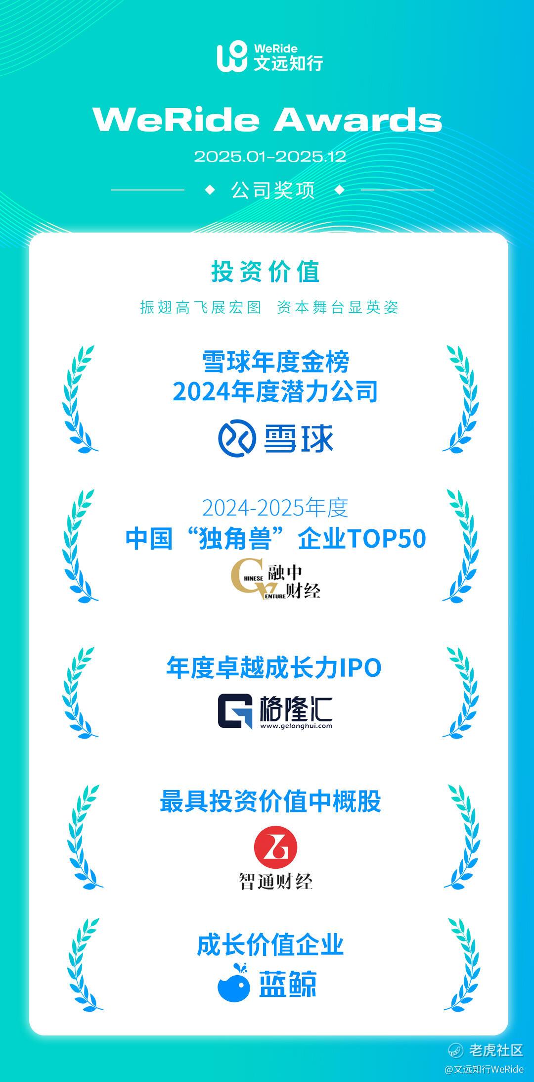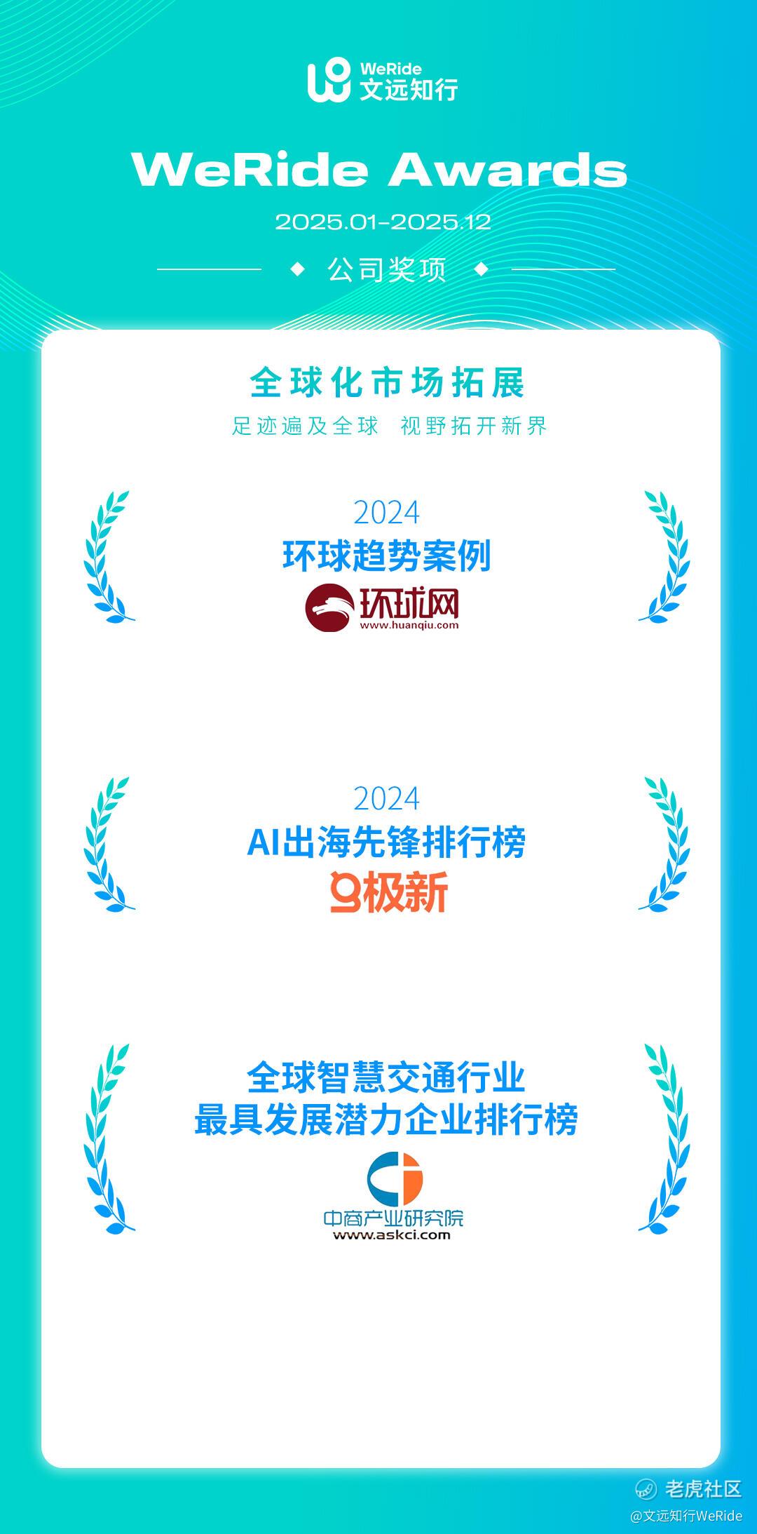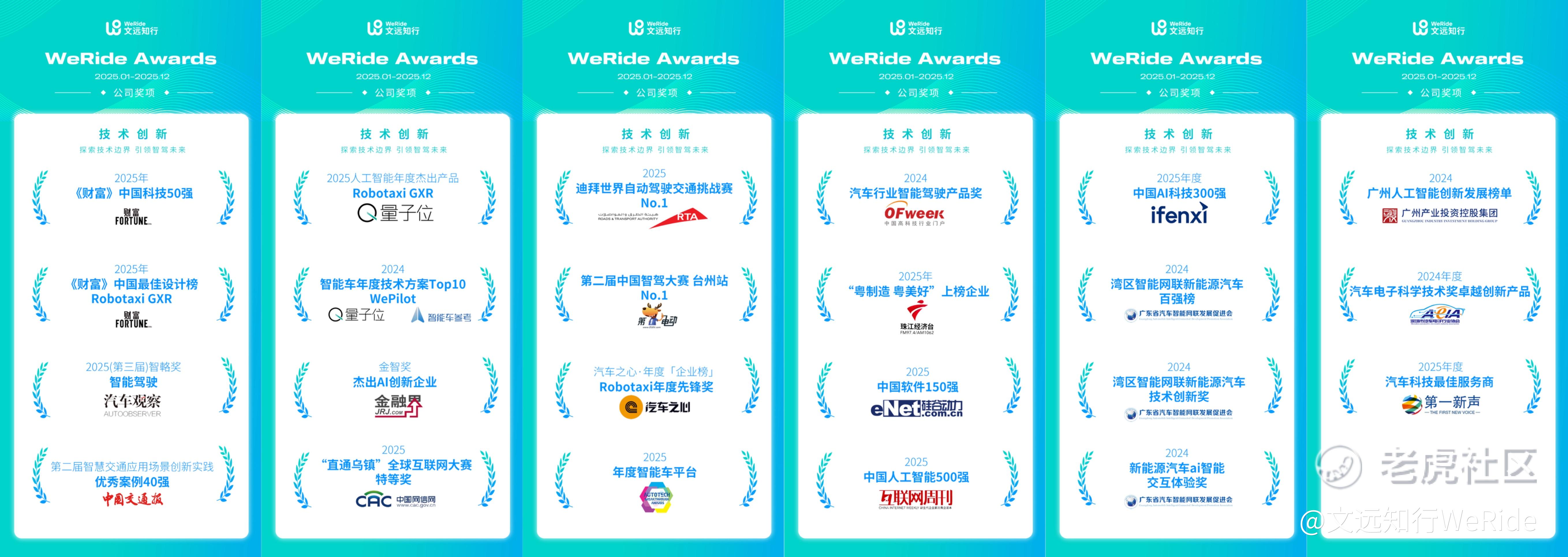 2025年,文远知行WeRide(NASDAQ: WRD,HKEX: 0800)乘势而上。继2024年登陆纳斯达克成为“全球 Robotaxi 第一股”后,公司于11月6日在港股成功上市,成为“港股 Robotaxi 第一股”,开启资本市场新篇章。凭借持续突破的技术革新、全球开花的国际化布局,以及按下加速键的商业化成果,文远知行2025年斩获海内外62项权威奖项,赢得了财富Fortune、福布斯Forbes、36氪、量子位、雪球、广东省工业和信息化厅、迪拜道路交通管理局RTA等全球顶尖媒体、智库与政府机构的高度认可。