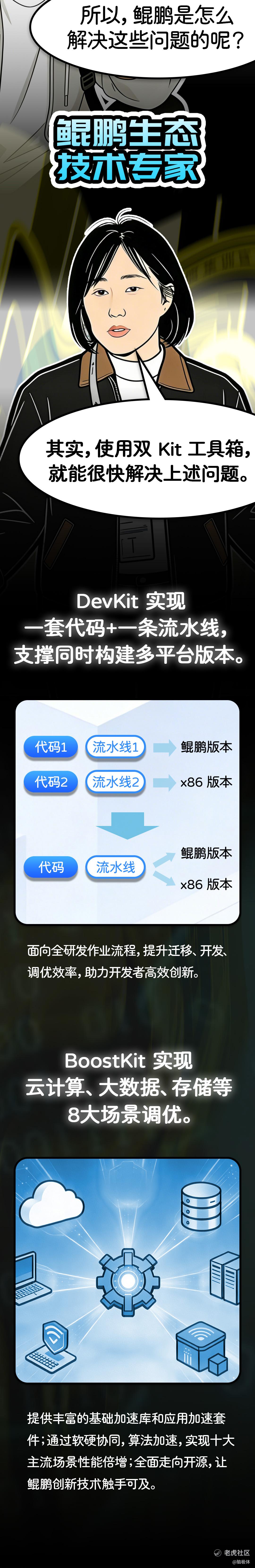 在前段时间的鲲鹏开发者创享日里,李朋亲眼看到,鲲鹏开发者生态,正是这座算力图书馆的「索引地图」:它以鲲鹏处理器为底座锚定架构标准,用openEuler、openGauss等开源语言打通系统壁垒,依靠DevKit、BoostKit等技术搭建高效连接通道,让架构迁移更便利、让算力获取更方便。