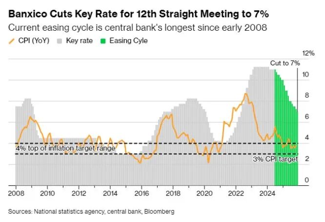 墨西哥则顺应了全球降息趋势,在 12 月连续第十二次下调利率,至 7%,这为股市等风险偏好较高的资产带来提振。与此同时,墨西哥 7% 的利率依然高于美国等国家,这也为套利交易创造了条件。