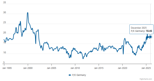 根据 worldperatio.com 的数据,截至 12 月,德国股市的远期市盈率达到约 18.46 倍,显著高于过去 5 年 12.04-16.04 的平均市盈率区间。