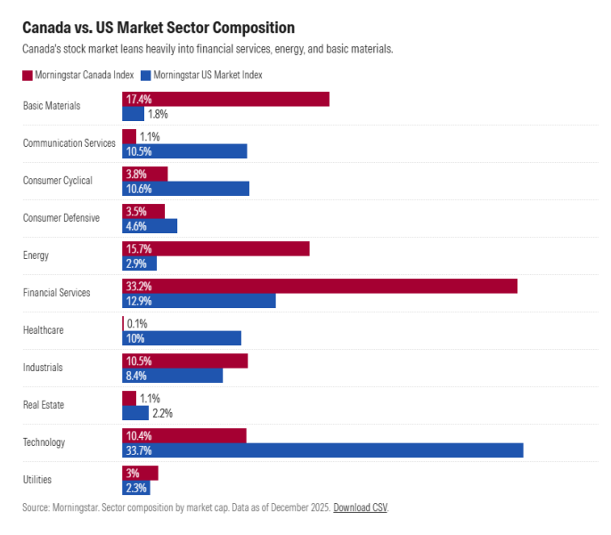 晨星公司在一份报告中指出,构成加拿大股市主引擎的三大板块 —— 金融 (占指数 32%)、材料 (17%) 和能源 (15%)—— 均在 2025 年获得顺风助力。