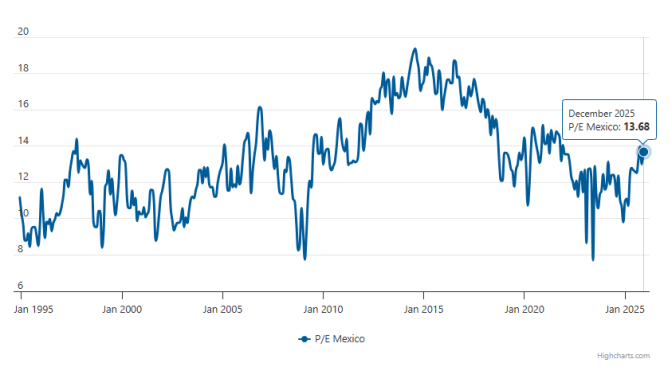 估值方面,尽管今年大幅上涨,该国股市估值依然处于合理水平。根据 worldperatio.com 的数据,截至 12 月,墨西哥股市的远期市盈率为约 13.68 倍,仅略微高于过去 5 年 11.62-13.47 的平均市盈率区间。