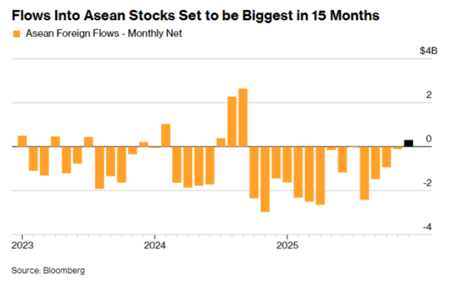 摩根大通分析师上月曾指出,“温和的估值水平正让东盟市场对价值型投资者的吸引力逐步提升,尤其是在盈利增长出现反弹的情况下”。从 12 月的资金流向数据来看,这一判断已得到验证。