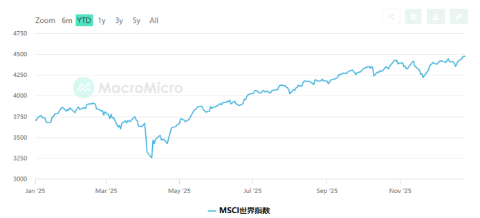 这一年,市场在特朗普关税政策的冲击下加剧震荡,甚至一度推动包括美国在内的多国股市跌入技术性熊市。尽管如此,全球市场最终展现出惊人韧性。在各自增长叙事驱动下,多国股指屡创新高,并推动 MSCI 全球指数在 2025 年再度实现两位数涨幅。截至发稿,该指数年内已累计上涨逾 20%,连续第三年涨幅突破 15%。
