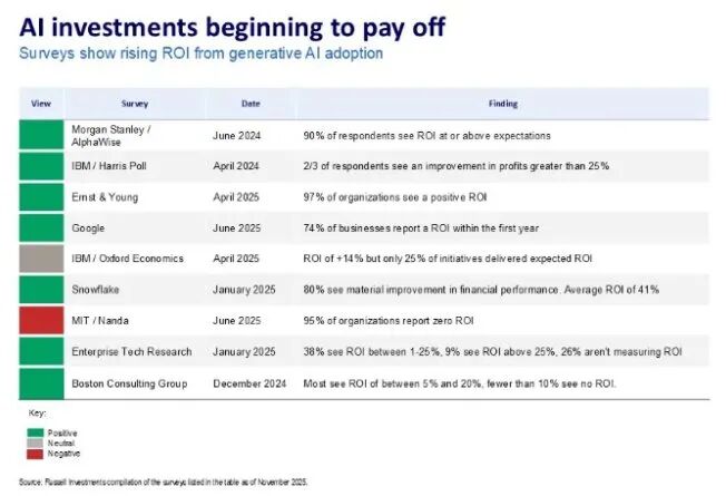 并且,AI 正从概念热潮转向实际生产力提升与利润率扩张。Russell Investments 援引咨询机构、超大规模云厂商及资产管理公司的调研指出,企业已开始从生成式 AI 部署中获得正向投资回报。