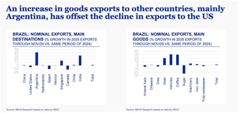 值得一提的是,巴西经济的一大亮点还在于其出口结构多元化,这有效降低了美国关税上调所带来的风险。通过将出口重心转向阿根廷等其他市场,巴西有力支撑了经济增长。尽管对美国等市场的出口额大幅下滑,今年前 11 个月巴西整体出口仍实现了约 2% 的增长。