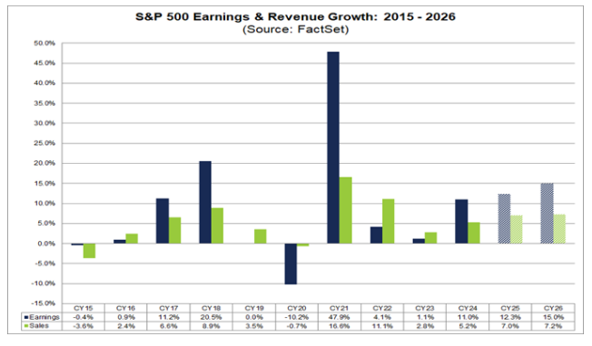 在 2026 年,企业盈利有望创下历史新高。FactSet 数据显示,标普 500 指数将在明年连续第三年实现两位数盈利增长。2026 年的预期盈利增长率 (同比) 为 15.0%,高于过去十年 (2015-2024 年) 8.6% 的年均盈利增速。若全年实现 15.0% 的增速,这将是标普 500 指数盈利连续第六年增长,也是连续第三年实现两位数增长。