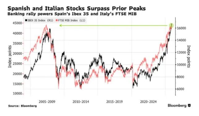 相比之下,西班牙和意大利股市就为德国提供了很好的借鉴。凭借银行股的强劲涨势,西班牙基准股指 IBEX 35 在 10 月成功突破并刷新了自 2007 年金融危机以来的历史收盘高点,更以全年约 47% 的累计涨幅成为全球表现最亮眼的指数之一。意大利富时 MIB 指数同样在 11 月触及 2001 年以来的最高水平,全年大涨逾 30%。