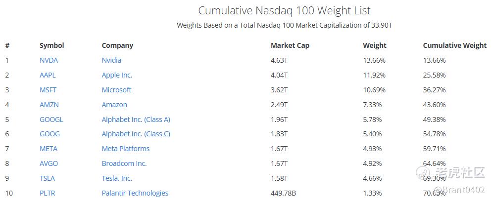相比之下,特斯拉与Meta的权重则出现一定程度的回落。尽管两家公司仍稳居纳斯达克100前十大成分股之列,但在指数整体权重再平衡过程中,其相对占比有所下调。