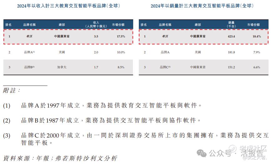 2024年,按教育交互智能平板营业收入计,公司品牌希沃以17.5%的市场份额位居全球第一,中国内地的市场份额达53.8%;按教育交互智能平板销量计,公司品牌希沃以18.4%的市场份额位居全球第一,中国内地的市场份额达50.7%。