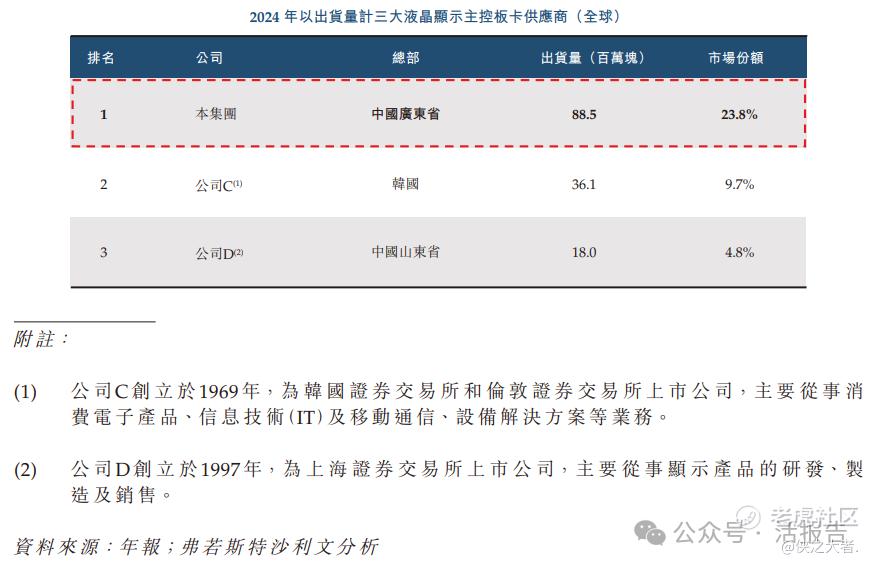 2024年,按液晶显示主控板卡出货量计,全球前三大公司合共占约38.3%,其中公司以约23.8%的市场份额位居全球第一。