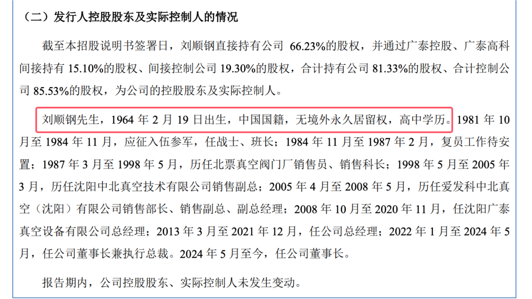 5 、 IPO 说明书显示,公司的董事长刘顺钢先生,1964 年 2 月 19 日出生,中国国籍,无境外永久居留权,高中学历。1981 年 10 月至 1984 年 11 月,应征入伍参军,任战士、班长;1984 年 11 月至 1987 年 2 月,复员工作待安 置;1987 年 3 月至 1998 年 5 月,历任北票真空阀门厂销售员、销售科长;1998 年 5 月至 2005 年 3 月,历任沈阳中北真空技术有限公司销售副总;2005 年 4 月至 2008 年 5 月,历任爱发科中北真 空(沈阳)有限公司销售部长、销售副总、副总经理;2008 年 10 月至 2020 年 11 月,任沈阳广泰 真空设备有限公司总经理;2013 年 3 月至 2021 年 12 月,任公司总经理;2022 年 1 月至 2024 年 5 月,任公司董事长兼执行总裁。2024 年 5 月至今,任公司董事长。作为一个成功的企业家,可以说是逆袭的典型,年底虽然有些不顺,也是很成功的,后面我们祝公司补充材料后成功!