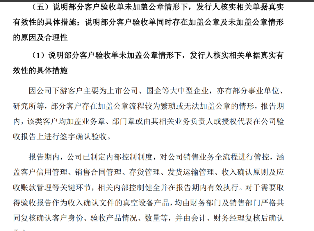 2 、在审核意见中,上市委要求就收入确认的准确性及依据充分性继续论述。看了一下公司的 IPO 说明书和问询文件,这个问题北交所早就问询过了,因为北交所发现这个公司的合同存在 2 个问题,第一是周期长,部分客户验收时间超过 15 个月,还有一些验收合同是没有公章的。当时公司和保荐人都回复了,但显然上市委还是简单可能有问题。