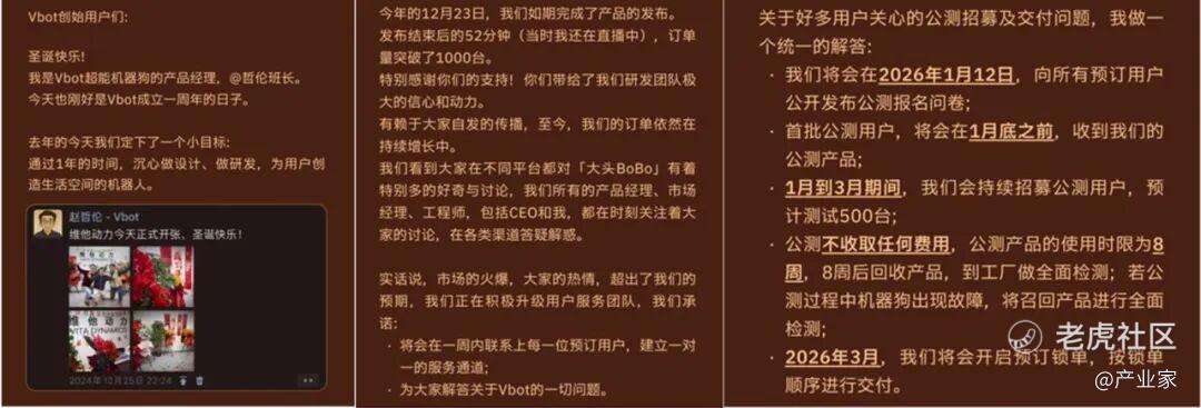 这种“以用户为中心”的底层逻辑,不仅体现在产品定义上,更贯穿于后续的服务闭环中。12月25日,正值品牌成立一周年,Vbot维他动力联合创始人@哲伦班长在给创始用户的信中公布了细致的交付图:承诺一周内联系每一位预订用户,建立一对一服务;2026年1月开启500台免费公测。值得注意的是,这些公测机在8周使用后必须回厂检测。