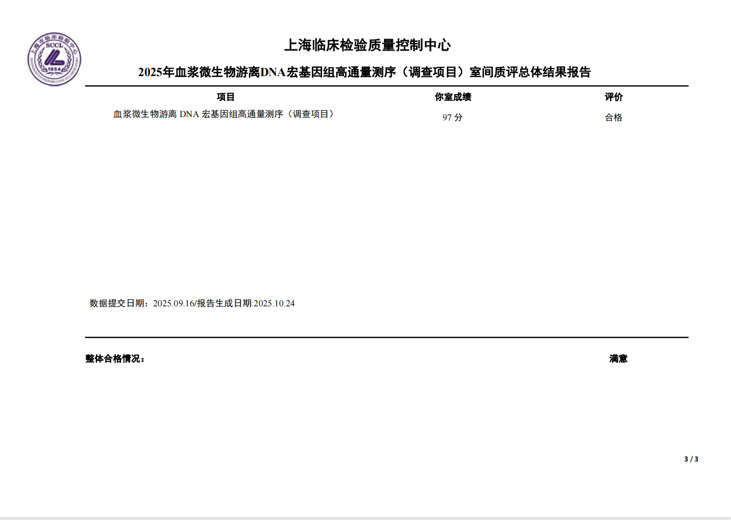 喜报!上海信诺佰世高分通过2025年血浆微生物游离DNA宏基因组高通量测序室间质评