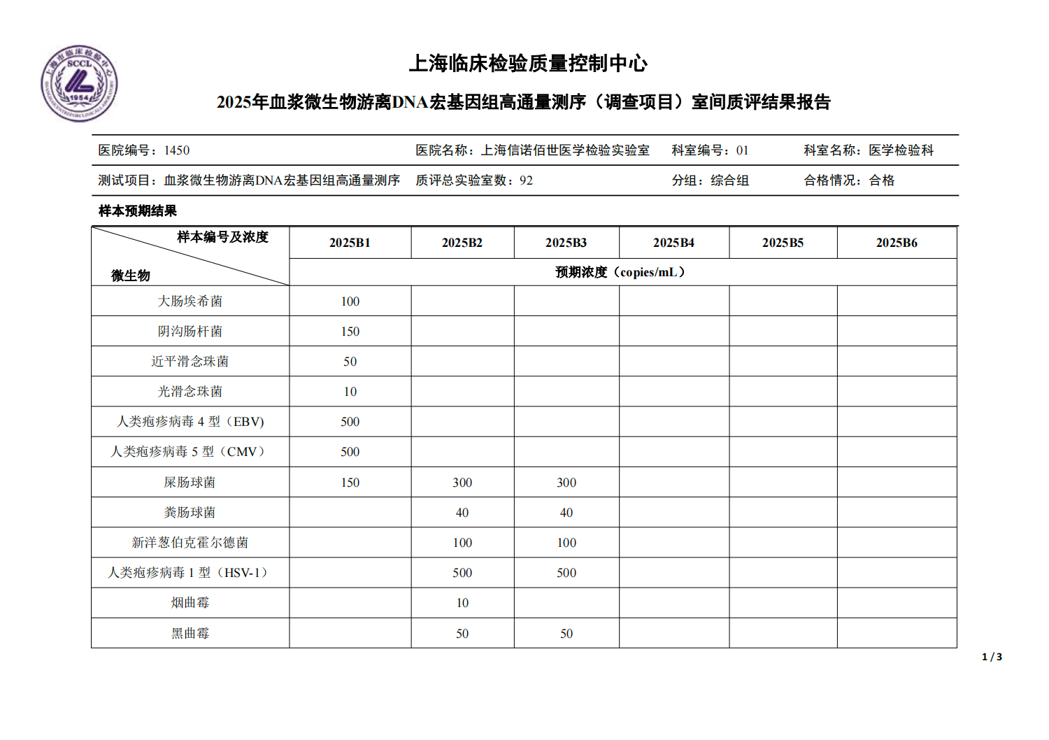 近日,上海临床检验质量控制中心公布了《2025年血浆微生物游离DNA宏基因组高通量测序(调查项目)室间质评结果报告》。康圣环球旗下子公司上海信诺佰世凭借自主研发的宏基因组检测技术平台及严格的全流程质控体系,以高分成绩通过本次严苛考评,再次彰显了其在病原微生物精准诊断领域的技术实力与质量管理水平。