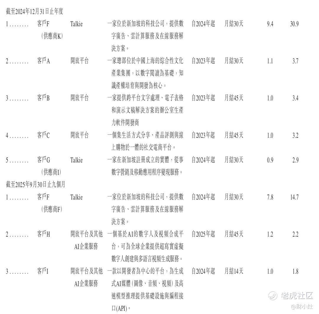 这其中,MiniMax合作的前五大客户也在招股书中进行了相应披露,比如2023、2024年都位列前五的小红书、阅文集团和金山办公(WPS),2025年的企业指向性不强,比较明显的是一家AI数字人及视频合成平台,结合MiniMax披露信息推测为Veed。