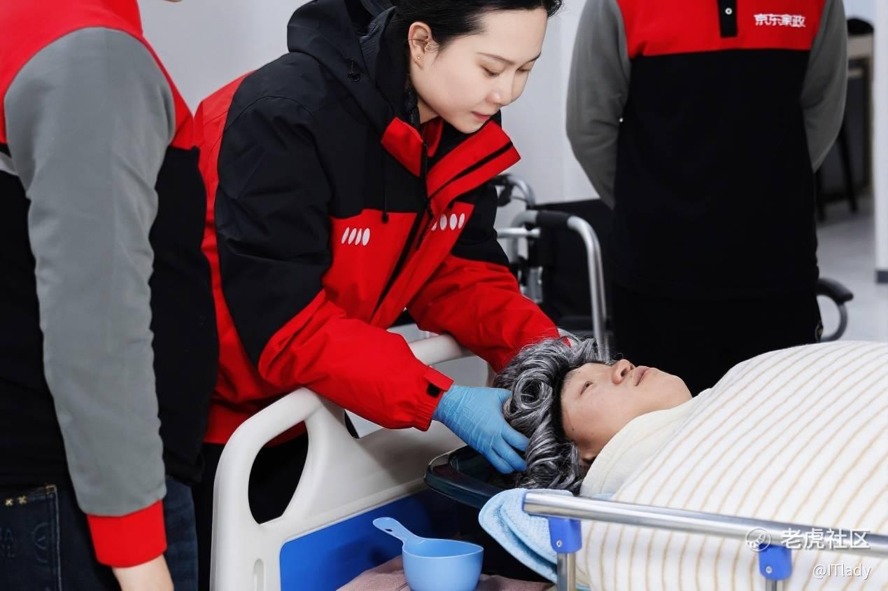 图注:京东家政养老特色服务课程上,学员学习为失能老人进行肢体康复训练、卧床洗头