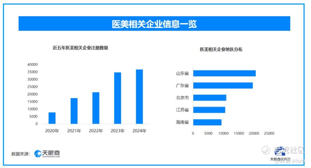 天眼查专业版工商信息数据显示,截至目前我国现存在业、存续状态的医美相关企业超18.7万家。其中,2025年截至目前新增注册相关企业约3.6万余家,从企业注册数量趋势来看,近五年间,医美相关企业的注册数量呈现出逐年增长的态势,并在2024年达到顶峰。从区域分布来看,山东省、广东省、北京市医美相关企业数量位居前列,分别为超2万余家、1.9万余家和1万余家。排在其后的是江苏省和海南省。
