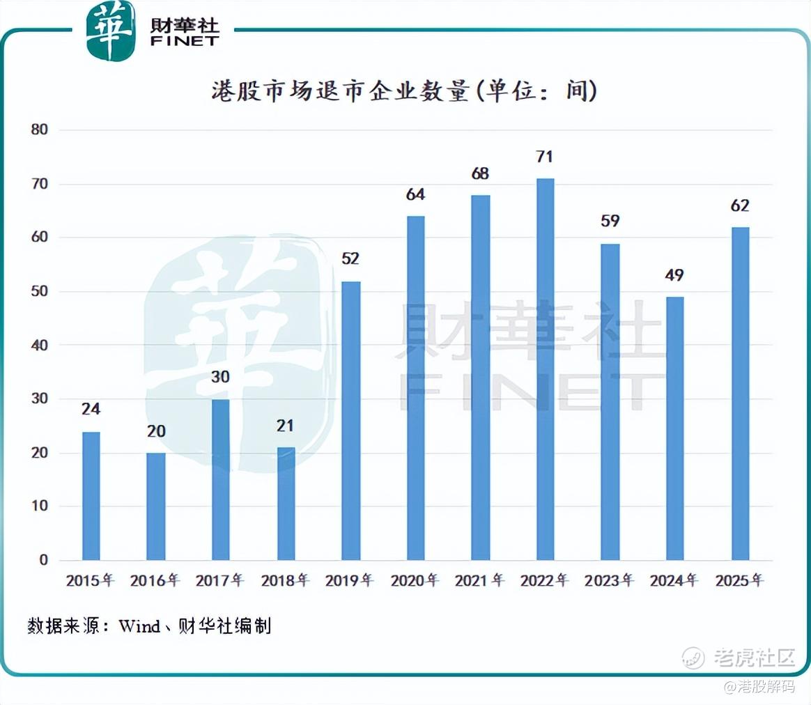 2025年即将收官,Wind数据显示,年内多达62家企业在港交所完成摘牌退市。相比去年全年的49家,增加了13家,增幅达26.5%。