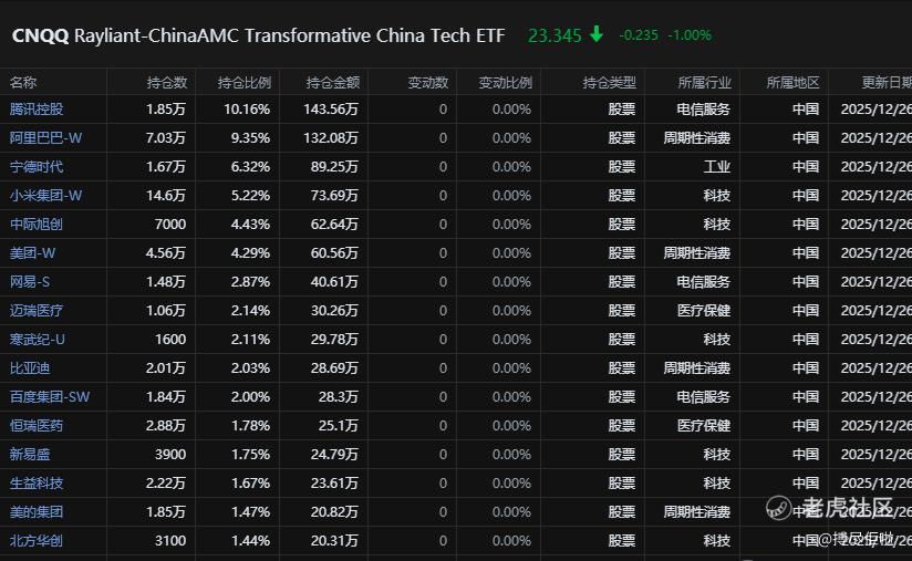 而上次提到的那只CNQQ $Rayliant-ChinaAMC Transformative China Tech ETF(CNQQ)$ ,综合型AI的ETF,基本全赛道都占,抛弃了旧经济的消费,收息,公用等版块,专注投资在科技领域。而这半年一载里我们已经清楚看到中方从追赶到看齐的决心,基本已是共识,从投资角度讲,后来居上的空间远比已站第一位的空间大,假如市场已经饱满,第一位的空间甚至会收窄,所以估值上中方的科技股不以”市盈率”去估值,是以市盈率的增速去估值,这也是为什么一百几十倍PE的科技股还能继续涨的原因,因为今年100倍PE,增速100%明年可能就50倍PE,再过一年就25倍。