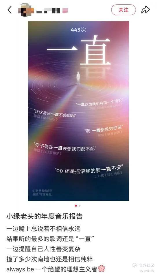 听歌关键词、音乐颜色、月度听歌这几个页面在社媒被高频刷屏探讨,有网友根据关键字自我剖析,“来自小绿老头(INFJ)的年度音乐报告,一边嘴上总说着不相信永远,结果听的最多的歌词还是‘一直’”。