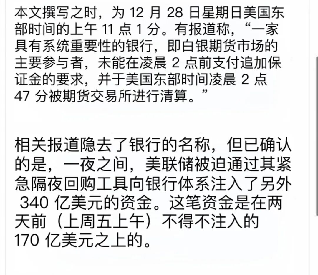 年末白银市场剧烈震荡之际,一则"系统重要性银行白银爆仓、美联储紧急注资340亿美元"的传言在社交平台病毒式扩散。