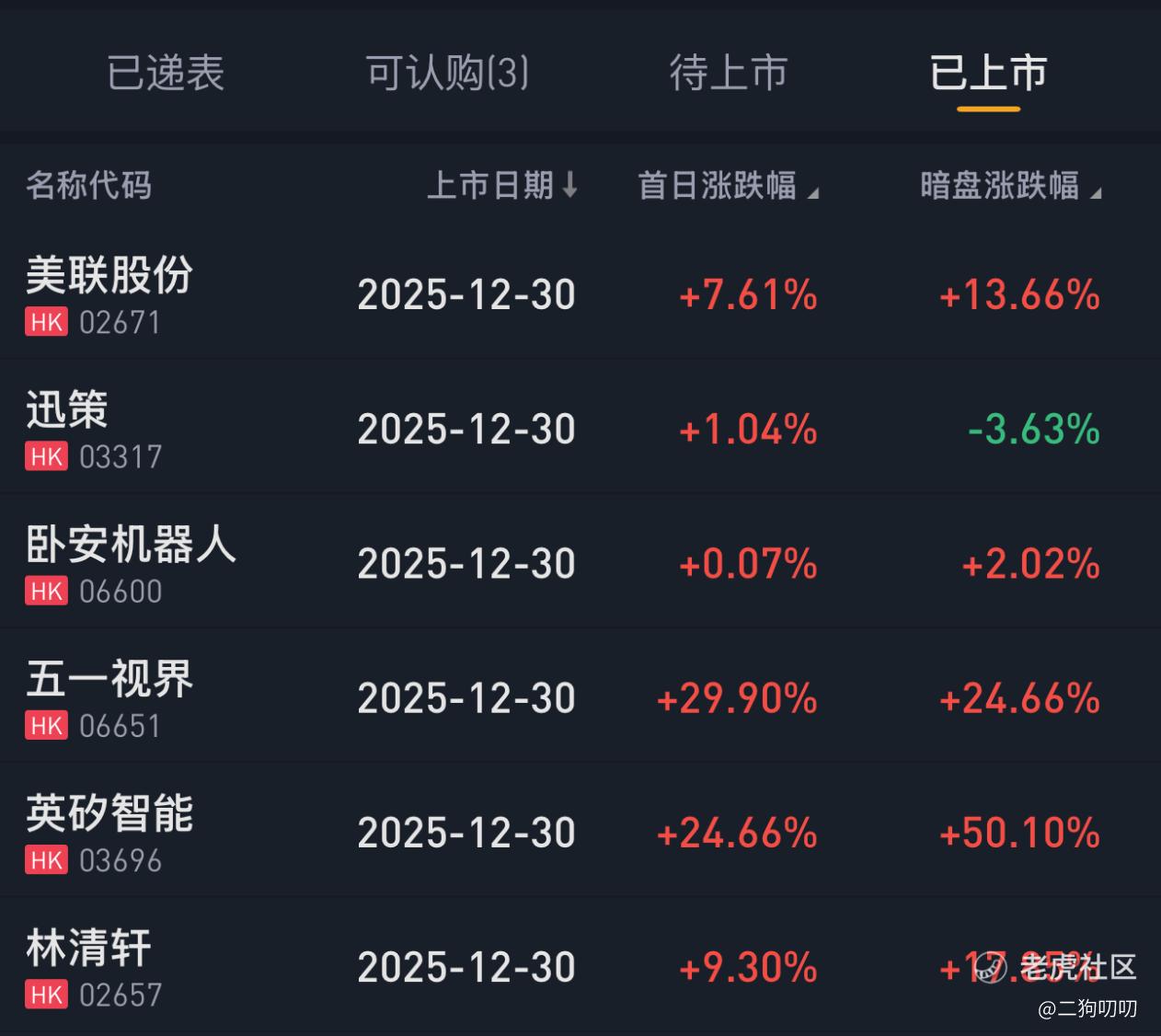 今天6个新股一起上,收盘全部上涨,不过涨幅都不大,涨幅最高的居然是五一视界涨幅29.9%, $英矽智能(03696)$ 次之涨幅24.66%, 卧安机器人涨幅最少,只有0.07%,算是保住了颜面。。。
