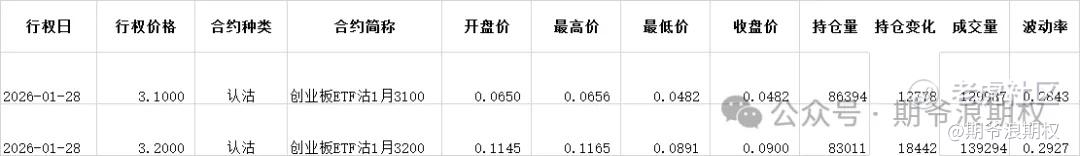 (3)创业板ETF期权:12月最大持仓范围3100-3200,今收3.229,上涨0.75%。期权1月合约,认购以增仓为主,集中在3100-3600,合计3.0W张;认沽全部都是增仓,集中在2800-3400,合计6.2W张。变化超过1W张的仓位如下: