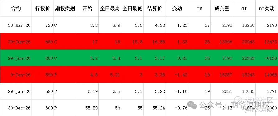 (1)腾讯:1月最大持仓范围600-650,窝轮牛熊街货分布570-635,今收600.0,上涨0.59%,又重新站上600大关。期权盘路变化超过1000张的仓位如下,红色是增仓较大,绿色是减仓较大的。继昨天之后,大佬们开继续在26年6月重仓,有增有减,增量较大。总体来说,市场还是偏乐观。