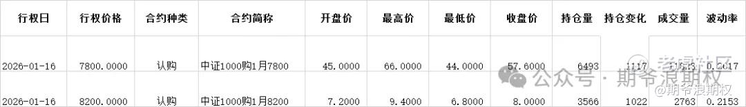 (4)中证1000期权:1月最大持仓范围7300-7500,今收7597.30,上涨0.04%。期权1月主力合约,认购是低行权价减仓高行权价增仓,减仓较少,增仓集中在7500-8200,合计4200张;认沽以增仓为主,集中在7000-7700,合计2600张。变化超过1000张的仓位如下: