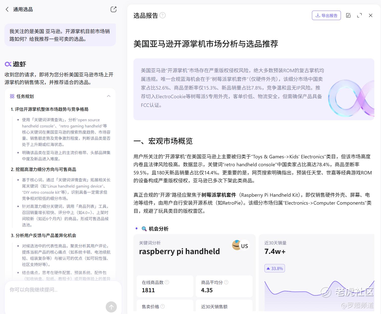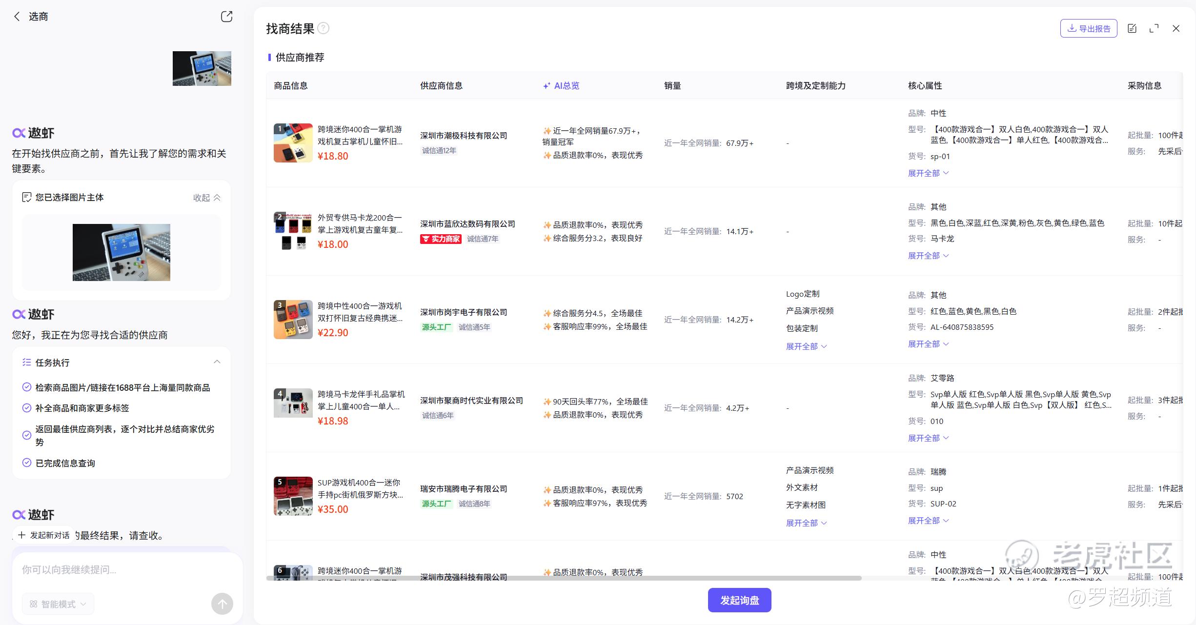 当你输入“开源掌机目前市场销路如何?给我推荐一些可卖的选品”,它不会给你写一首关于主题的诗,而是直接甩给你一份市场分析报告,告诉你哪种款式是蓝海,那些产品存在风险,顺便把能做这个货的源头工厂推给你。