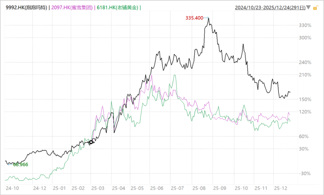 三季度之前,无论是港股还是A股,新消费都是市场主线风格之一。泡泡玛特、蜜雪集团、老铺黄金被并称为港股新消费“三剑客”,股价均经历快速上行。