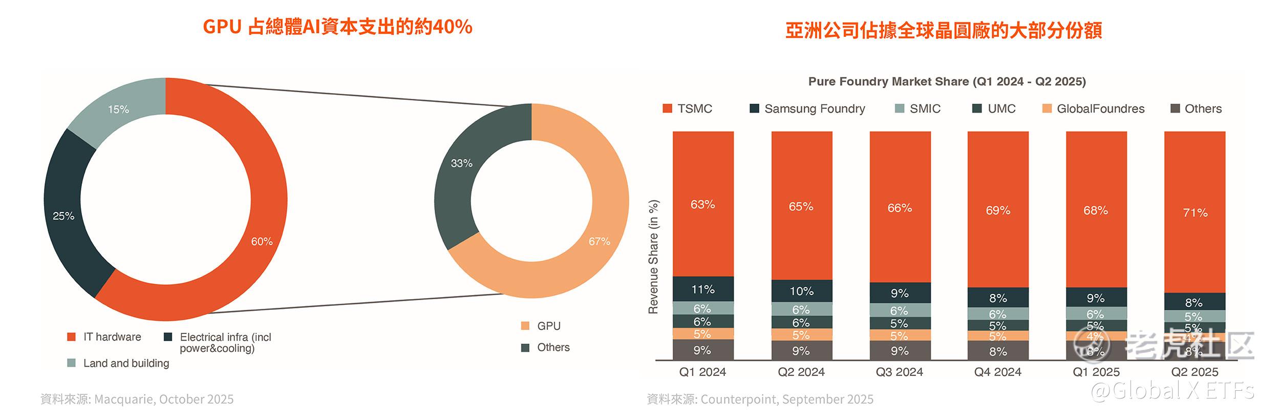 围绕人工智慧(AI)领域是否存在泡沫的争论仍在持续。我们仍然对 AI 投资主题的可持续性保持积极的态度,但同时也承认 AI 股票的估值风险。我们策略是转向投资 AI 基础设施,由于人工智慧发展的瓶颈正从半导体转移至资料中心、电力设备和储能系统。这些环节是 AI 规模化发展及应用的核心推动力:关注 Global X AI 基础设施 ETF (3401 HK) $GXAI基础设施(03401)$ 近期的进展印证了这一观点。谷歌的 TPU 已通过 Gemini 验证了其性能,并正为向协力厂商商业化做准备—这对英伟达的统治地位构成了切实的挑战。亚马逊等公司也在加速自研晶片的开发。然而,无论设计环节如何变化,半导体制造环节仍然集中在亚洲:台积电 负责制造,SK 海力士提供 HBM(高频宽记忆体)供应。历史上,英伟达 攫取了 AI 价值链中的大部分利润;展望未来,亚洲的半导体制造商有望获得更大的份额:关注 Global X 亚洲半导体 ETF (3119 HK) $GX亚洲半导体(03119)$