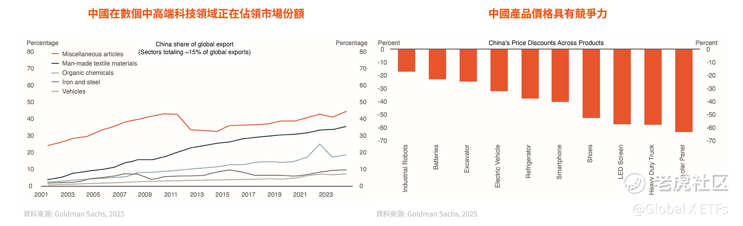 – 中国在人才(受过教育但相对低成本的劳动力)、资本(某些行业有低融资成本)和政策(比如政府在能源和土地方面的支持)方面的优势,使其具有强大的制造竞争力。通过出口,中国商品正在占领全球市场,通过成本效益和日益提高的品质标准这两大优势,逐渐挤压竞争对手。
