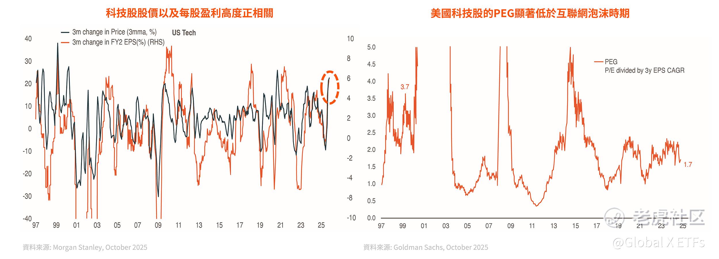 – 从盈利增长(PEG 指数)来看,在历史背景下,科技股票的估值处于合理范围内。