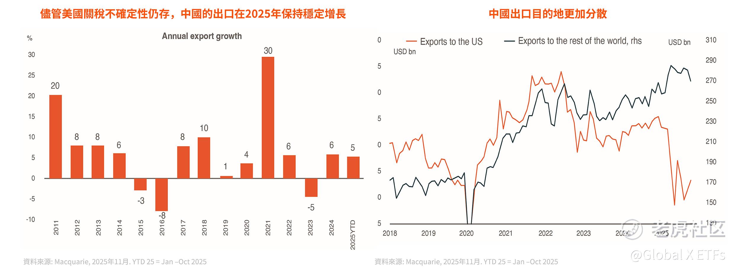 – 尽管美国关税不确定性仍然存在,中国的出口在 2025 年仍然保持稳定增长。主要驱动因素包括出口目的地多元化,中国愈发强大的制造业竞争力,以及温和偏弱的货币
