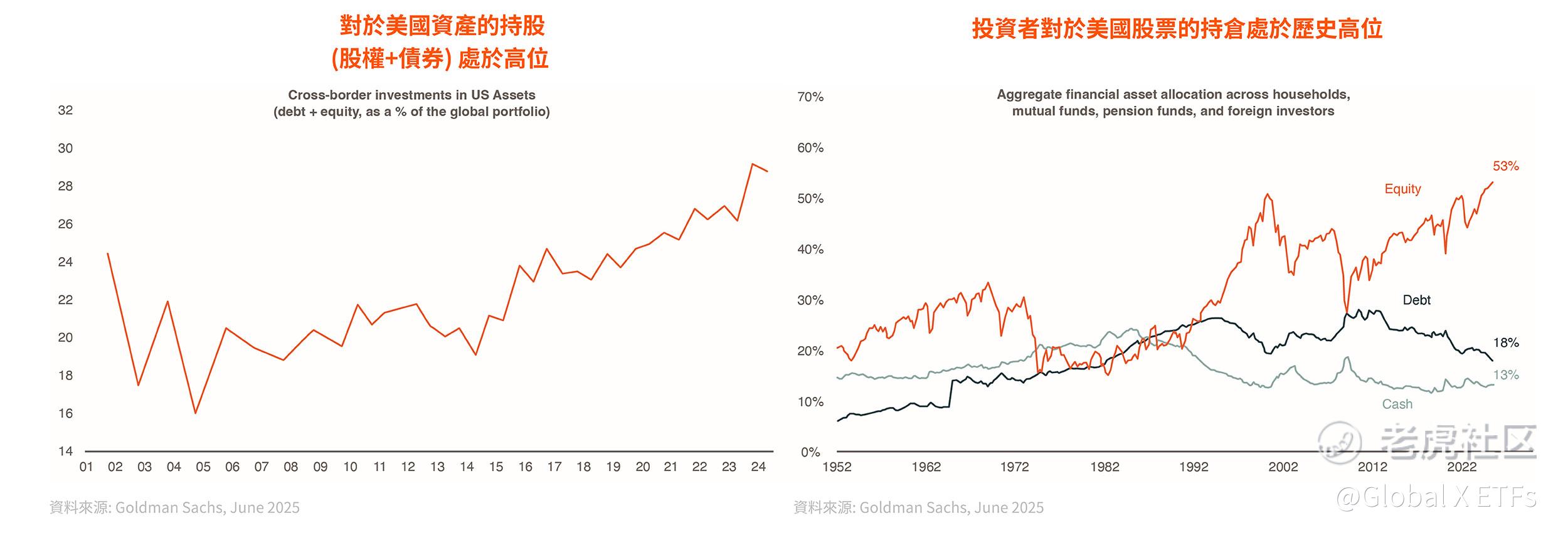 – 在这一轮买入潮之后,非美投资者持有的美国资产总量以及美国投资者自身持有的美股仓位元,均处于历史高位。这意味著,随著新兴市场复苏,存在资产抛售的风险,特别是对非美投资者而言。