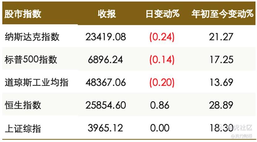 l 美国股市标普500指数和纳斯达克指数周二在震荡交投中小幅收跌,通信服务股上涨被科技股和金融股下跌的影响盖过,金融股也给道琼斯工业指数造成拖累。美元上涨,在美联储12月会议记录公布后保持涨势,投资者试图解析货币政策走向。油价大致持稳,盘中走势震荡,投资者在权衡俄乌达成和平协议的希望,围绕也门的中东地缘政治紧张局势加剧。贵金属在前一交易日大幅下跌后反弹,因市场重新关注地缘政治和经济风险,黄金涨势被重新点燃,势将创下自1979年以来表现最好的一年。