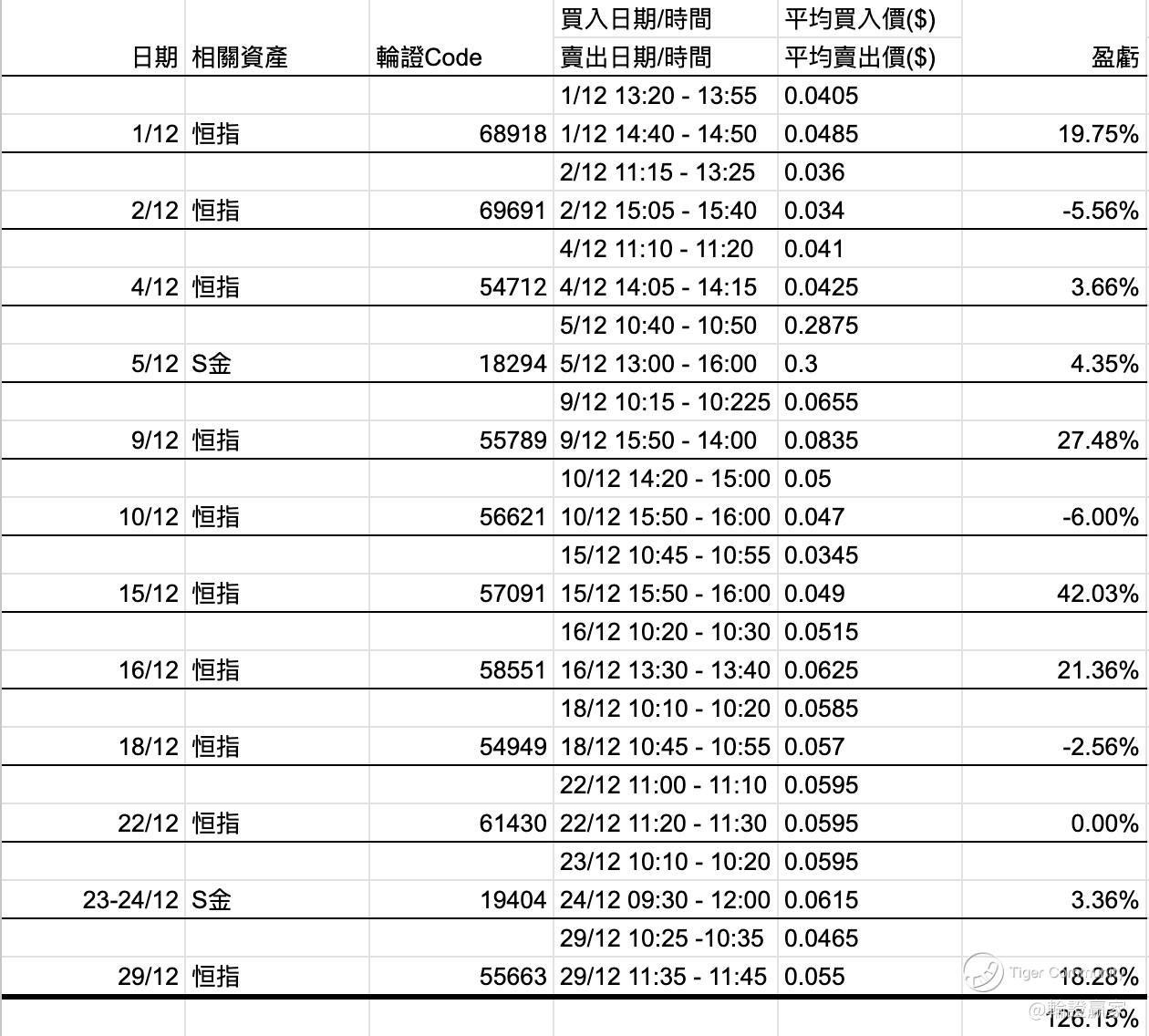 以12月份有19个全日交易日及两个半日交易日计,当中有12次成功出仓计,平均大约两日成功出仓一次。