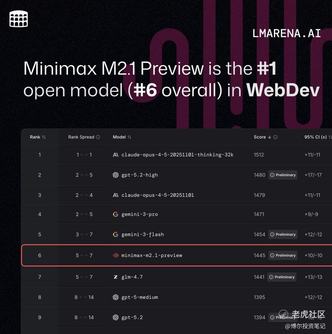近日 LMArena AI 的 WebDev 榜单更新,MiniMax M2.1 Preview 直接冲到全球第四,也是国内第一。身前站着的是 Anthropic OpenAI 和 Google 这些老牌巨头,能在巨头盘踞的赛道里杀出一席之地,这份成绩单足够亮眼。