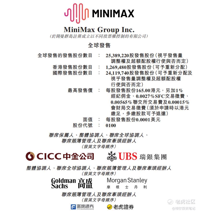 根据招股书披露的核心细节,MiniMax 本次 IPO 拟发行 25,389,220 股,定价区间为 151 至 165 港元/股,在不考虑发售量调整权及超额配股权行使的情况下,发行估值将介于 461.23 亿港元至 503.99 亿港元之间。