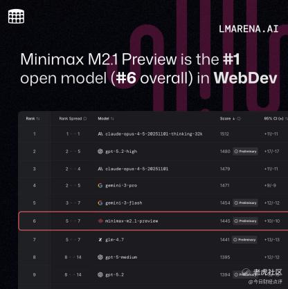 近日,在 LMARENA.AI 的 WebDev 榜单中,MiniMax M2.1 Preview 跻身全球第四名(前三名为Anthropic、OpenAI及Google)、中国第一。不仅如此,传奇程序员、Web开发框架Ruby on Rails之父DHH在X上对MiniMax M2.1给予高度评价,称其处理复杂代码库时展现出了令人印象深刻的高效能力。