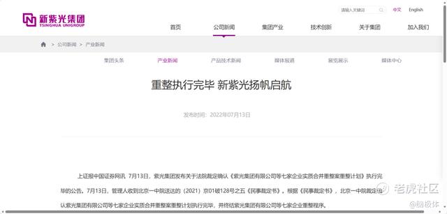 2020年11月,紫光集团出现债券违约。根据2021年年底所披露的信息,截至2021年6月30日,紫光集团重整主体资产客观公允的市场价值约1214.78亿元,拟化解债务约1376.09亿元,达到了资不抵债的标准。2021年7月,北京市第一中级人民法院宣布,受理债权人对紫光集团的破产重整申请,必将影响中国半导体产业发展的千亿级别重整,随之拉开了帷幕。