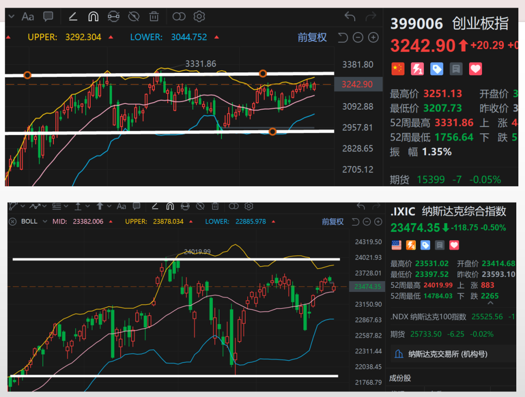 这在元旦前三天观察窗口出现,尤其是科技股(纳指、创业板)位于从9月份开始的震荡区间的上轨附近,这个位置是第四次接近前高。高位震荡横盘消耗的多头力量,低位震荡横盘消耗的是空头力量。