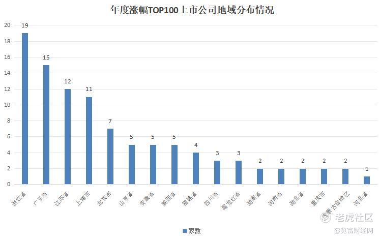 通过梳理A股年度涨幅排名前100位的上市公司可以发现,上市公司与地区经济活跃度呈正相关分布,排名前五的地区分别为浙江省(19家)、广东省(15家)、江苏省(12家)、上海市(11家)、北京市(7家)。