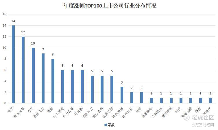 从行业分布来看,仍选取年度涨幅前100名的上市公司,排名前十的行业板块分别是电子(14家)、机械设备(12家)、汽车(10家)、基础化工(9家)、通信(8家)。