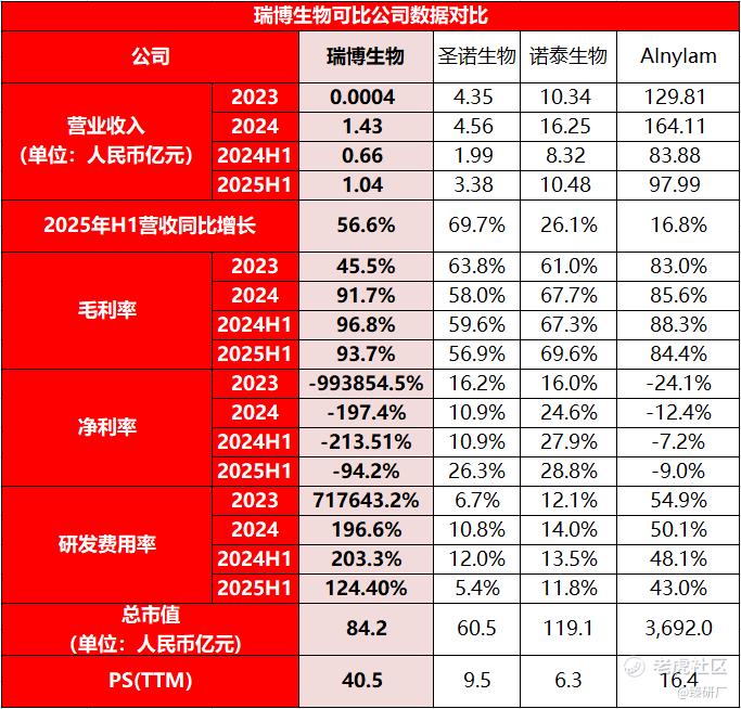 从盈利能力来看,当前瑞博生物的毛利率高于行业平均水平,但净利率低于行业平均水平。一方面因为技术授权与合作研发这类非产品收入毛利率本身就很高,叠加公司2025年H1营收因为与勃林格殷格翰的合作实现开发里程碑而同比大幅增长。规模效应凸显摊薄成本,进一步释放毛利空间;另一方面公司为了维持全球布局多个研发中心+七款进入临床试验阶段的自研药物,持续且高额的研发费用率也对利润造成了拖累。而可比公司由于都有已商业化产品,多元化的业务结构贡献广泛的收入来源,整体盈利能力更强更稳定。