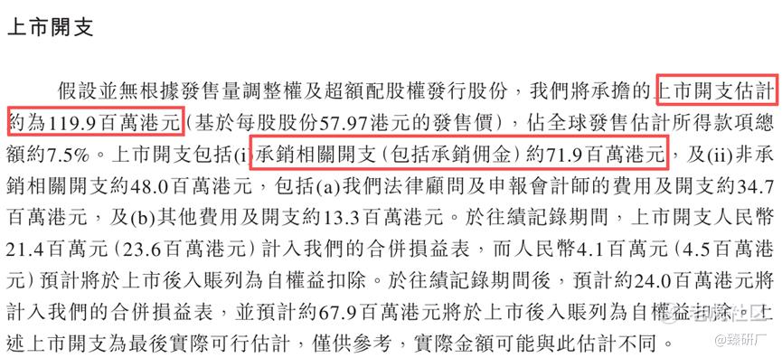 此次瑞博生物IPO的开支总额估计约为1.199亿港元,按发售价57.97港元计算,募资总额约15.93亿港元,开支占比约为7.5%。其中包销相关开支及费用7,190万港元,占比约为4.5%。
